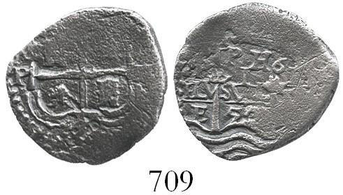 Potosi, Bolivia, cob 1 real, 1652E, post-transitional, 1-PH-6 at top. S-P37a; KM-13. 3.1 grams. Bold and nearly full pillars side, cross side incomplete. From the Consolacion, sunk in 1681 off Santa Clara Island, Ecuador, with ROBCAR photo-certificate #M100275.