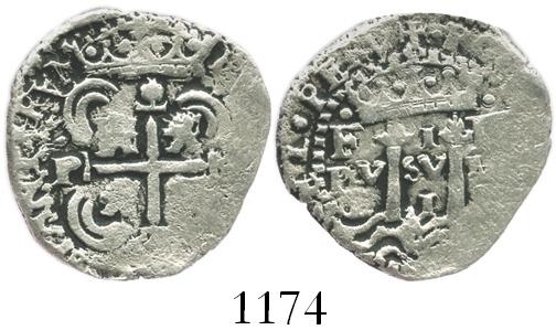 Potosi, Bolivia, cob 1 real, 1652E transitional Type VI. S-P37; CT-1050. 3.5 grams. Two 100%-full crowns, bold full cross and shield enhanced by dark sediment in crevices, lightly porous Fine+.