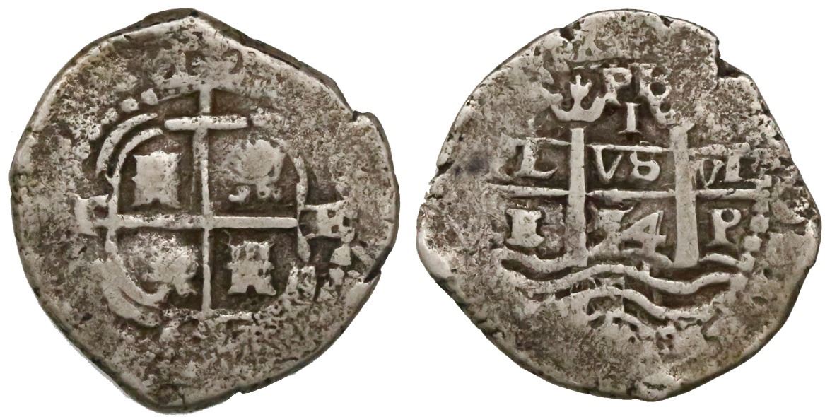 Potosi, Bolivia, cob 1 real, 1654E, PH at top. S-P37a; KM-13; CT-1054. 5.78 grams. Overweight flan (probably originally meant for a 2R), with full and well-centered pillars-and-waves and cross, Fine+ with toned fields.