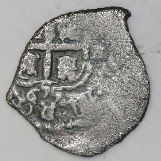 Potosi, Bolivia, cob 1 real, 1655E. S-P37a; KM-13; CT-1055. 2.65 grams. A bit thin from corrosion, off-center cross and pillars, full date below cross. With HRC photo-certificate #5119. Recovered from: Consolacion, sunk in 1681 off Santa Clara Island, Ecuador