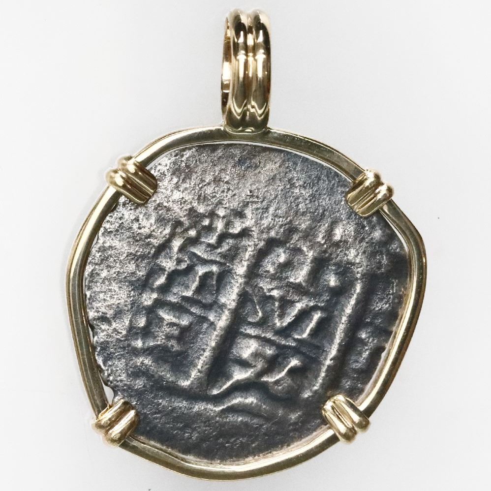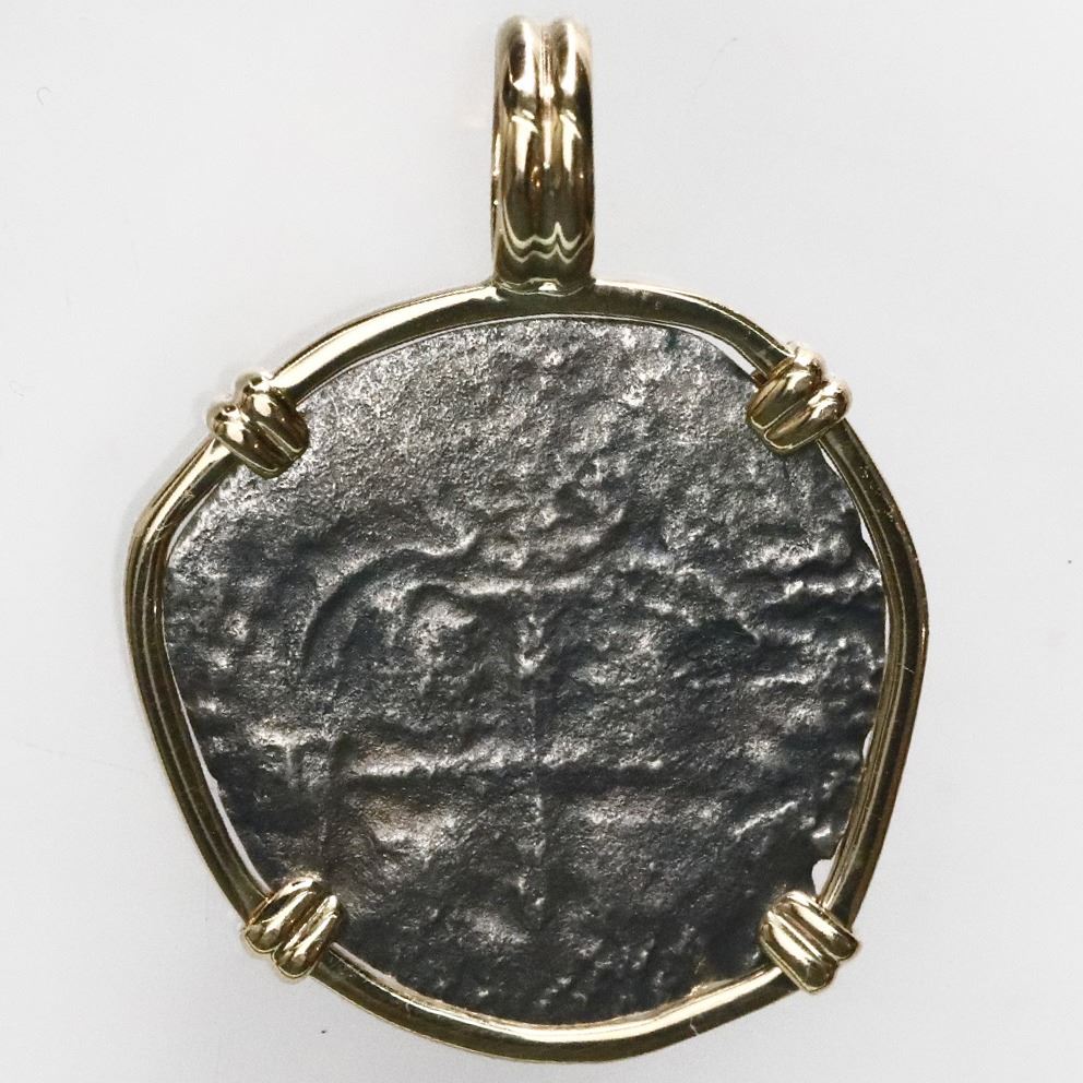 Potosi, Bolivia, cob 1 real, 1656E, ex-Consolacion (1681), mounted cross-side out in 14K gold bezel with fixed bail. 2.71 grams total. Bold full pillars with full date and assayer, the cross weaker, toned all over, lightly to moderately corroded, otherwise Fine. From the Consolacion (1681), with certificate.