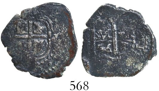 Potosi, Bolivia, cob 1 real, 1656E, rare denomination for this provenance. S-P37a; KM-13. 2.62 grams. Thin but well detailed, bold date, off-center strike, darkly toned, minimal corrosion. Recovered from: Unidentified ca.-1671 wreck in Seville harbor, Spain