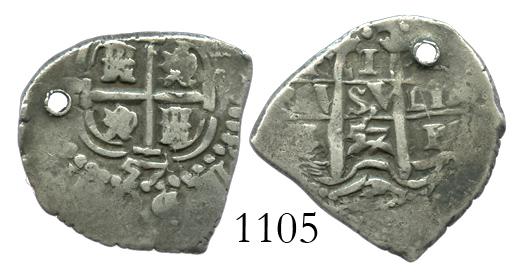 Potosi, Bolivia, cob 1 real, 1657E. S-P37a; KM-13; CT-1057. 2.8 grams. Choice full cross and pillars, 2 bold dates, richly toned AVF, holed at edge. Pedigreed to the Mark Bir collection.