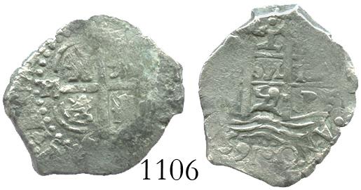 Potosi, Bolivia, cob 1 real, 1659E. S-P37a; KM-13; CT-1059. 3.1 grams. Full pillars with bold waves, full but weak cross, Fine with minor surface corrosion. Pedigreed to the Mark Bir collection.