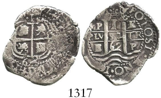 Potosi, Bolivia, cob 1 real, 1662E. S-P37a; KM-13. 3.5 grams. Choice full details on a very broad flan, with full POTOSI, 3 dates (rare thus), the cross-side legend crudely struck but all nicely toned and no worse than AVF.