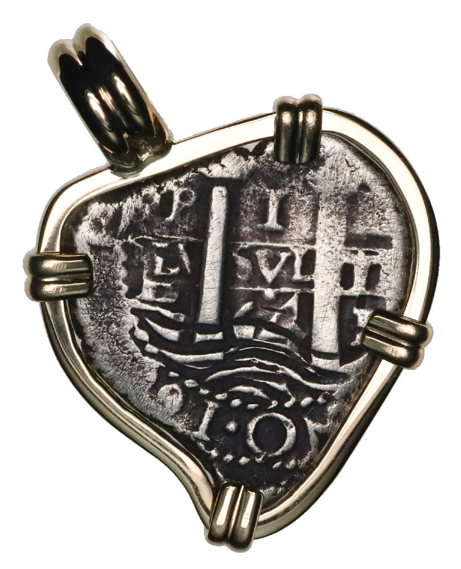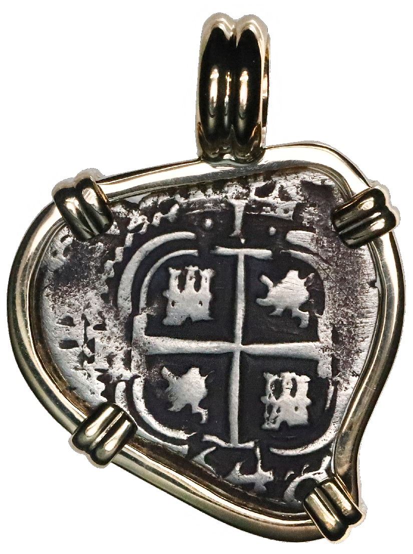 Potosi, Bolivia, cob 1 real, 1664E, mounted cross-side out in 14K gold bezel with fixed bail. 6.05 grams total. Lovely heart-shaped piece with exceptional full cross and full pillars-and-waves, two-and-a-half dates, VF with deeply contrasting toning on fields.