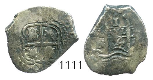 Potosi, Bolivia, cob 1 real, 1664E. S-P37a; KM-13; CT-1064. 3.2 grams. Full cross and pillars but crudely toned and weakly struck, Fine. Pedigreed to the Mark Bir collection.