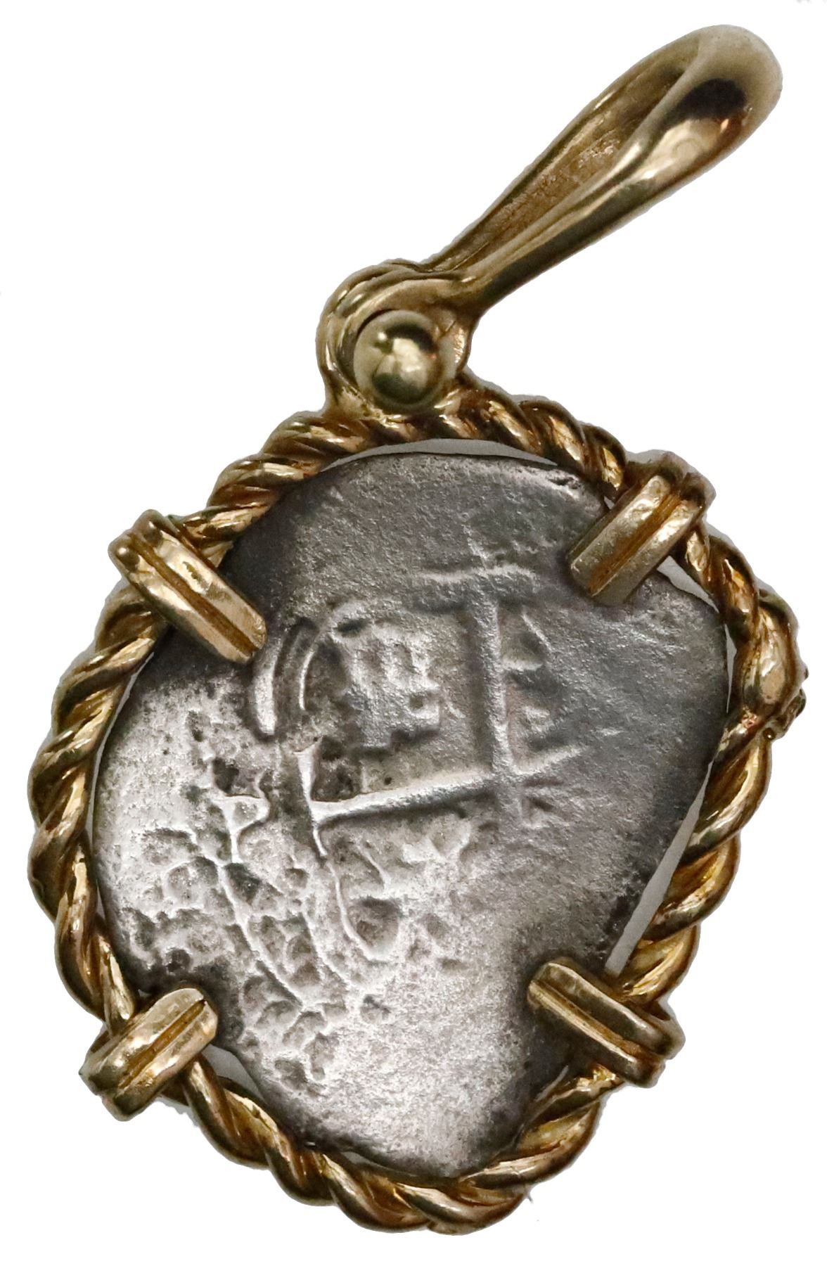 Potosi, Bolivia, cob 1 real, 1666E, ex-Consolacion (1681), mounted in twisted-wire 14K gold bezel with shackle bail. 4.59 grams total. Choice coin mounted cross side out with minimal saltwater corrosion and a good amount of design detail showing including the date and assayer. From the Consolacion (1681), with ROBCAR tag and photo-certificate #2020238. Coin recovered from:)Consolacion, sunk in 1681 off Santa Clara Island, Ecuador