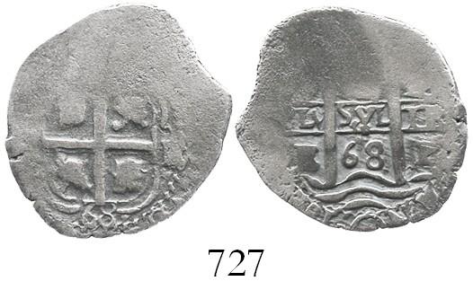Potosi, Bolivia, cob 1 real, 1668E. S-P37b; KM-23; CT-704. 2.9 grams. Broad flan but flat near edge, good cross and bottom of pillars, 2-1/2 dates, no corrosion. From the Consolacion, sunk in 1681 off Santa Clara Island, Ecuador, with ROBCAR photo-certificate #M100261.