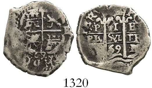 Potosi, Bolivia, cob 1 real, 1669E. S-P37b; KM-23; CT-705. 4.3 grams. Good full pillars and cross, 2 dates and assayers, AVF with peripheral flatness, darkly toned fields.