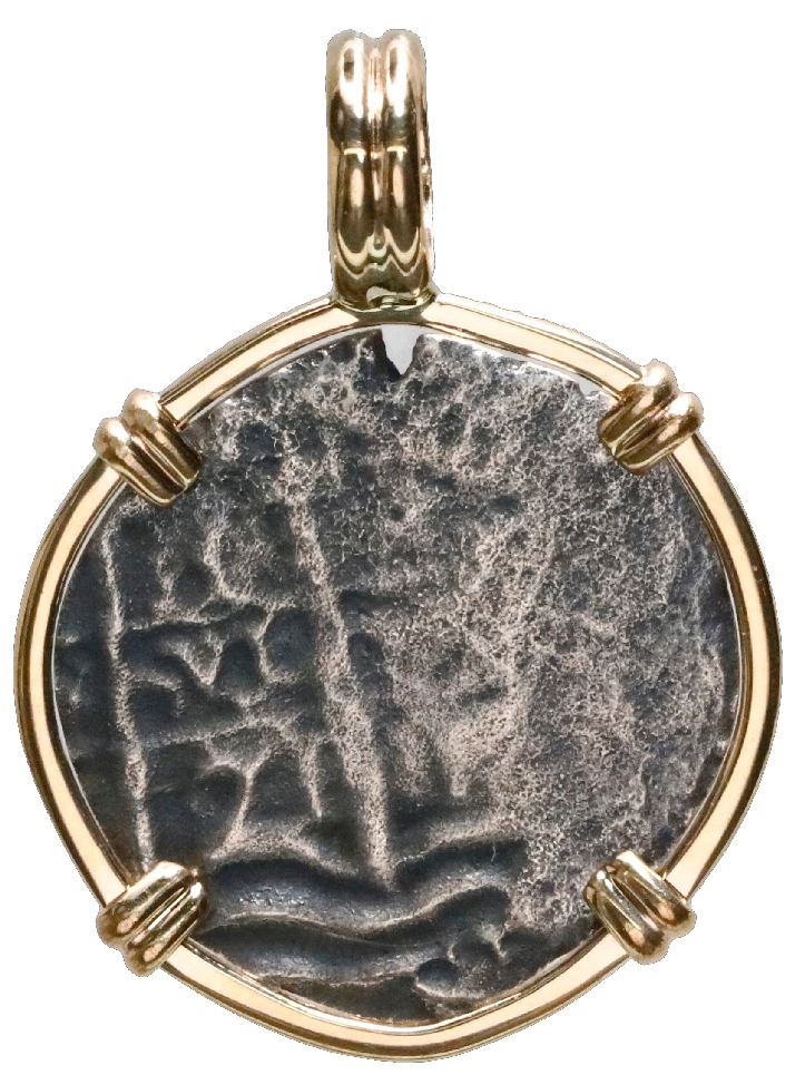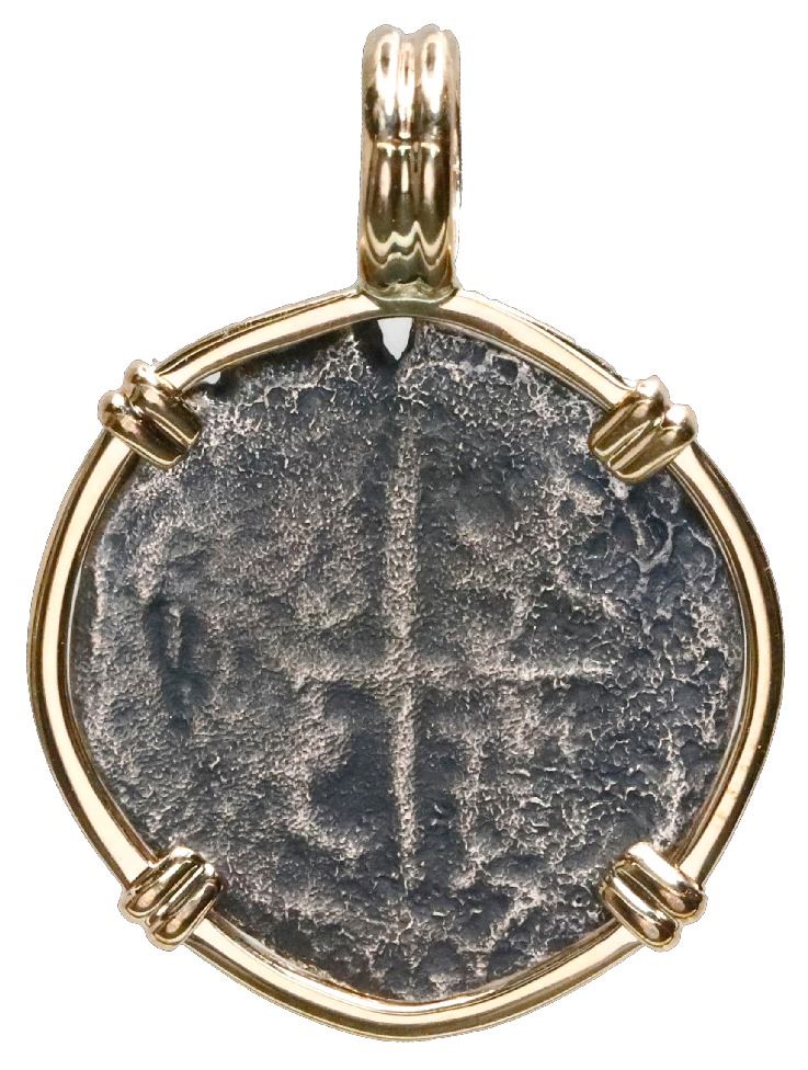 Potosi, Bolivia, cob 1 real, 1671E, ex-Consolacion (1681), mounted cross-side out in 14K gold bezel with fixed bail. 2.68 grams total. Dainty piece (small and round) with good full cross, full but off-center pillars-and-waves with bold date, lightly corroded all over but with nice toning. From the Consolacion (1681), with certificate.