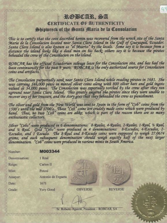 Potosi, Bolivia, cob 1 real, 1671E. S-P37b; KM-23; CT-707. 3.27 grams. Virtually corrosion-free and nicely toned, with well-detailed cross, nearly full waves, two dates. With ROBCAR photo-certificate #M003344. Recovered from: Consolacion, sunk in 1681 off Santa Clara Island, Ecuador
