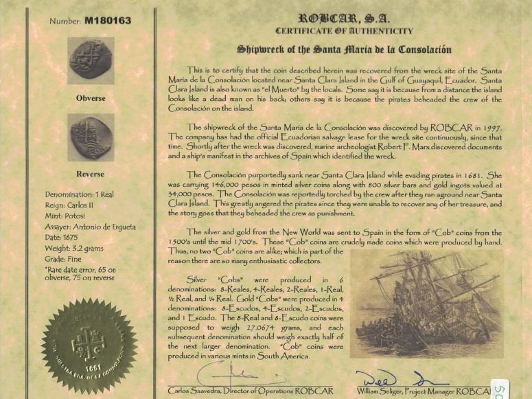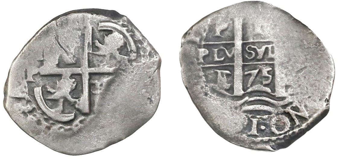 Potosi, Bolivia, cob 1 real, 1675+65E. S-P37b. 3.23 grams. Nice pillars with bold mintmark and assayer and date 75 (plus 16 in legend), the date below the cross 65 instead (scarce mule), minimal corrosion. With ROBCAR photo-certificate #M180163. Recovered from: Consolacion, sunk in 1681 off Santa Clara Island, Ecuador