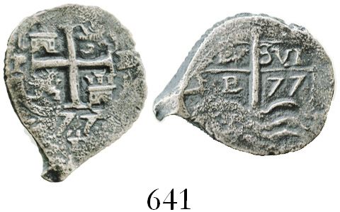 Potosi, Bolivia, cob 1 real, 1677E. S-P37b; KM-23; CT-713. 2.1 grams. Attractive teardrop shape, with 2 bold dates and nice full cross but light corrosion. Recovered from: Consolacion, sunk in 1681 off Santa Clara Island, Ecuador