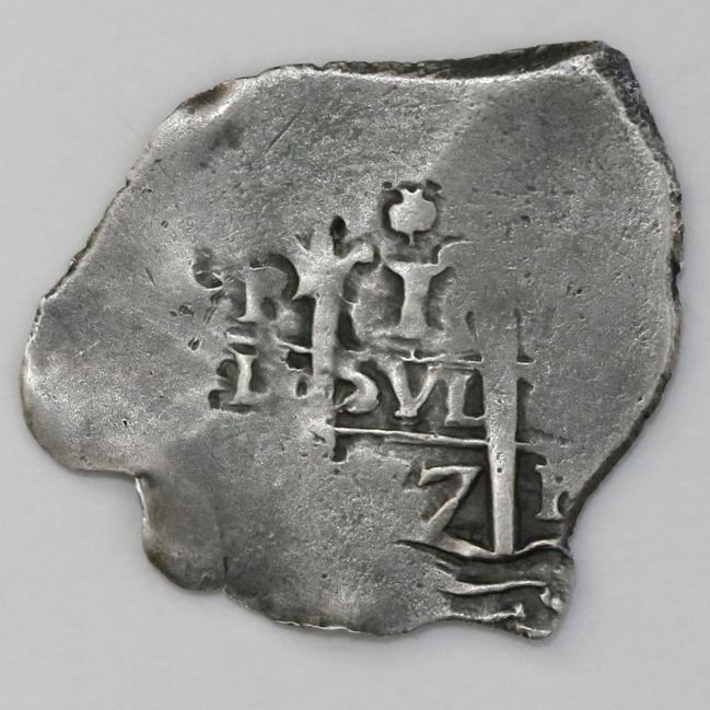 Potosi, Bolivia, cob 1 real, 1677E. S-P37b; KM-23; CT-713. 2.80 grams. Big flan but much flatness, no corrosion. With ROBCAR photo-certificate #M180151. Recovered from: Consolacion, sunk in 1681 off Santa Clara Island, Ecuador