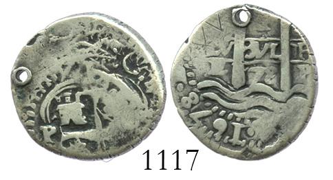 Potosi, Bolivia, cob 1 real, 1678E. S-P37b; KM-23; CT-714. 3.7 grams. Round flan (as made?), with 100% full and bold 4-digit date in legend, second date above full waves, crude and off-center cross, contrastingly toned Fine with odd old scratches and hole at very edge. Pedigreed to the Mark Bir collection.