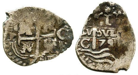 Potosi, Bolivia, cob 1 real, 1679C. S-P38; KM-23; CT-716. 2.2 grams. Bold C and date above full waves, second C to right of and clear date below good cross, old-toned VF.