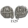 Potosi, Bolivia, cob 1 real, 1681V, struck on a 1/2R planchet (thin). S-P39; KM-23; CT-719. 1.6 grams. Bold date and waves and cross and Y, at first looks cut down but then it would not be so thin, Fine with good contrast.