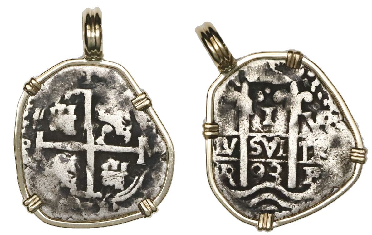 Potosi, Bolivia, cob 1 real, 1693VR, mounted cross-side out in 14K bezel. 3.59 grams total. Choice full cross and pillars-and-waves with deep, contrasting toning (Fine details), simple bezel.