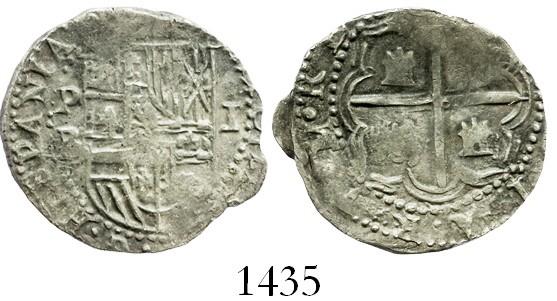 Potosi, Bolivia, cob 1 real, Philip II, assayer B (4th period). S-P12; KM-2.2; CT-649. 3.4 grams. Finely detailed VF, unevenly (lightly) toned.
