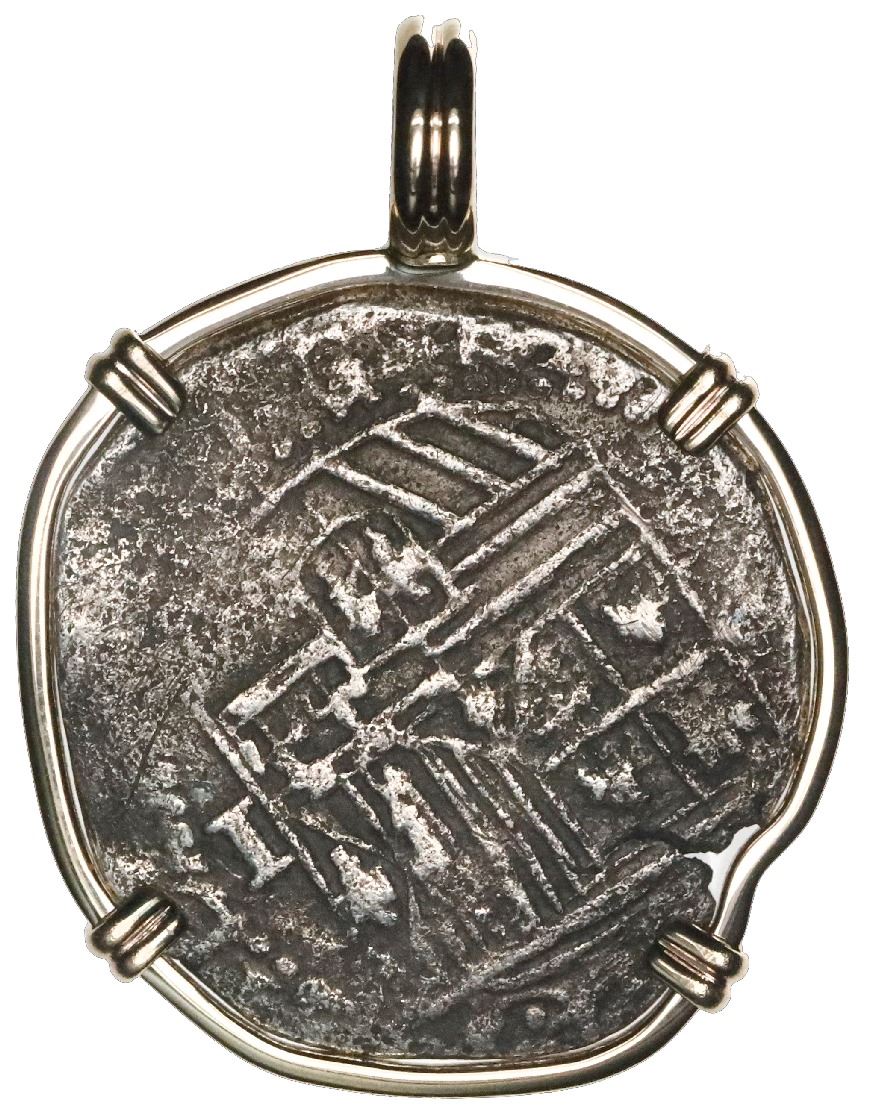 Potosi, Bolivia, cob 1 real, Philip II, assayer not visible, mounted cross-side out in 14K gold bezel with fixed bail. 4.55 grams total. Toned XF with light surface corrosion and edge-split, choice full cross and shield, bold denomination I, thin-gauge wire mount. With certificate.