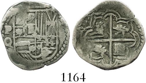 Potosi, Bolivia, cob 1 real, Philip III, assayer Q. S-P17; KM-7; CT-462. 3.1 grams. Bold P-Q, nice full shield and cross, attractively toned AVF.