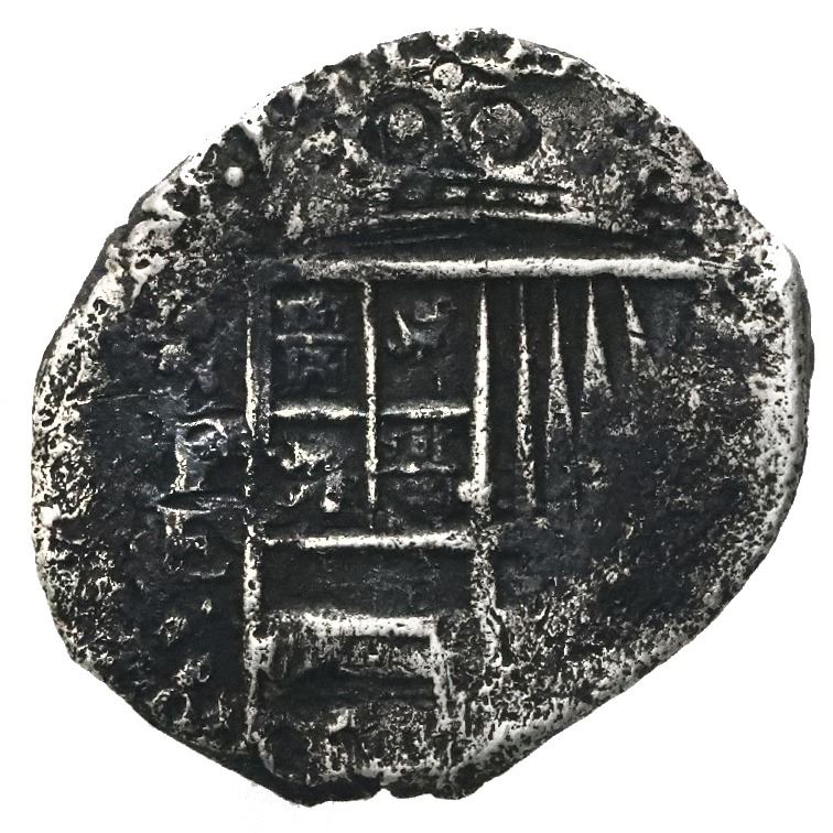 Potosi, Bolivia, cob 1 real, Philip IV, assayer E (1651-2). S-P36; KM-12b. 2.75 grams. Very bold design with minimal corrosion, clear assayer and mintmark, partial shield and cross, dark toning in fields. From: Capitana, sunk in 1654 off Chanduy, Ecuador
