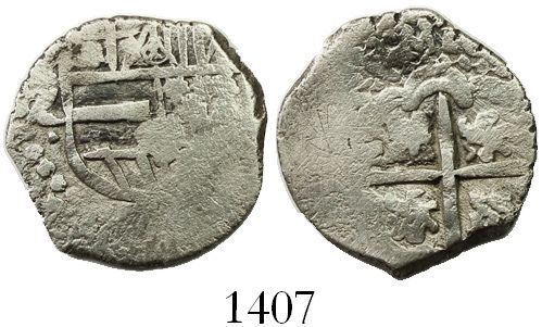Potosi, Bolivia, cob 1 real, Philip IV, assayer Z, rare. S-P34; KM-12a. 3.15 grams. Full assayer Z, full but off-center cross, silvery Fine with toning in crevices.
