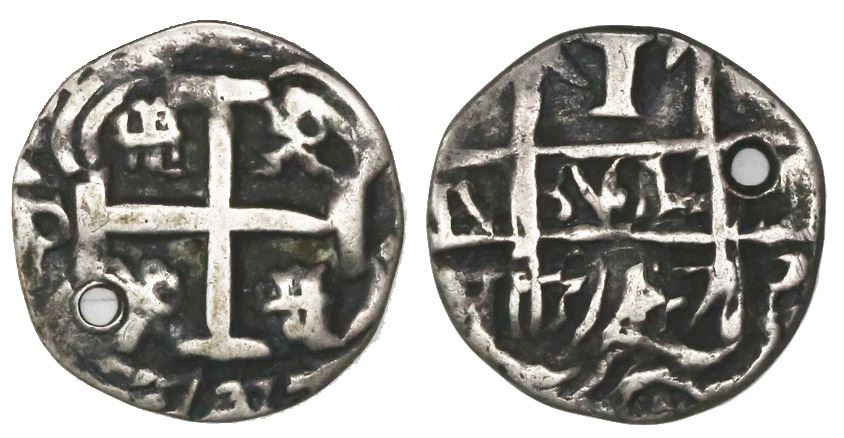Potosi, Bolivia, cob 1 real Royal, 1747q, rare. S-P50a; KM-unl. 2.18 grams. Very small (no legends) but bold and even in thickness, the cross choice but the pillars slightly doubled, VF with deeply toned fields, holed near edge.