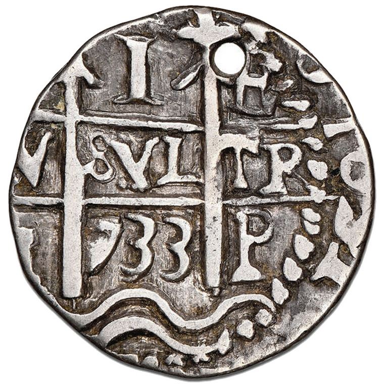 Potosi, Bolivia, cob 1 real Royal (galano), 1733 E, retrograde E to right of cross, extremely rare, NGC XF details / holed (not listed in census). Janson-46.6.2; S-P46; KM-unl; Cal-unl. 3.43 grams. Typically thick, round, even, but small-diameter flan with perfectly centered cross showing a clearly retrograde assayer E to right, the pillars side slightly off-center but with bold E in proper rotation at top-right, with lovely old toning but inevitable hole near top of cross / top of right pillar. It is quite possible this 1733 E is unique, as the erroneous Janson citation with assayer E makes reference to and shows a photo of the "Americas" collection example of 1733 YA (also unique). NGC #5902427-012. Pedigreed to the Heritage auction of January 2008 (lot #50309).