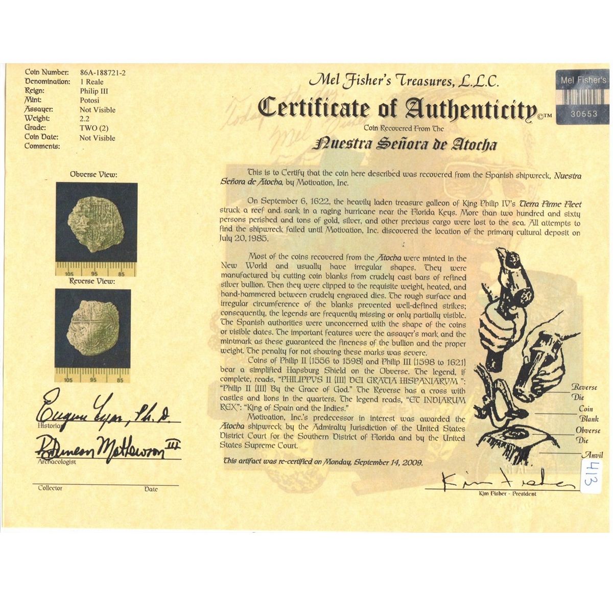 Potosi, Bolivia, cob "1 real" (actually a 2R?), Philip II, assayer not visible, Grade 2. 2.3 grams. This thin, corroded coin shows a fairly clear denomination ii to the right of the full shield, but the full cross-and-tressure with tiny lions and castles appears to be the correct size for a 1R, which is a very rare denomination from this wreck and is what appears on the Fisher tag and certificate; in our opinion it is either a 1R struck from a 2R shield die or an underweight 2R struck with a 1R cross die, interesting either way. With Fisher certificate #188721-2 Recovered from: Atocha, sunk in 1622 west of Key West, Florida