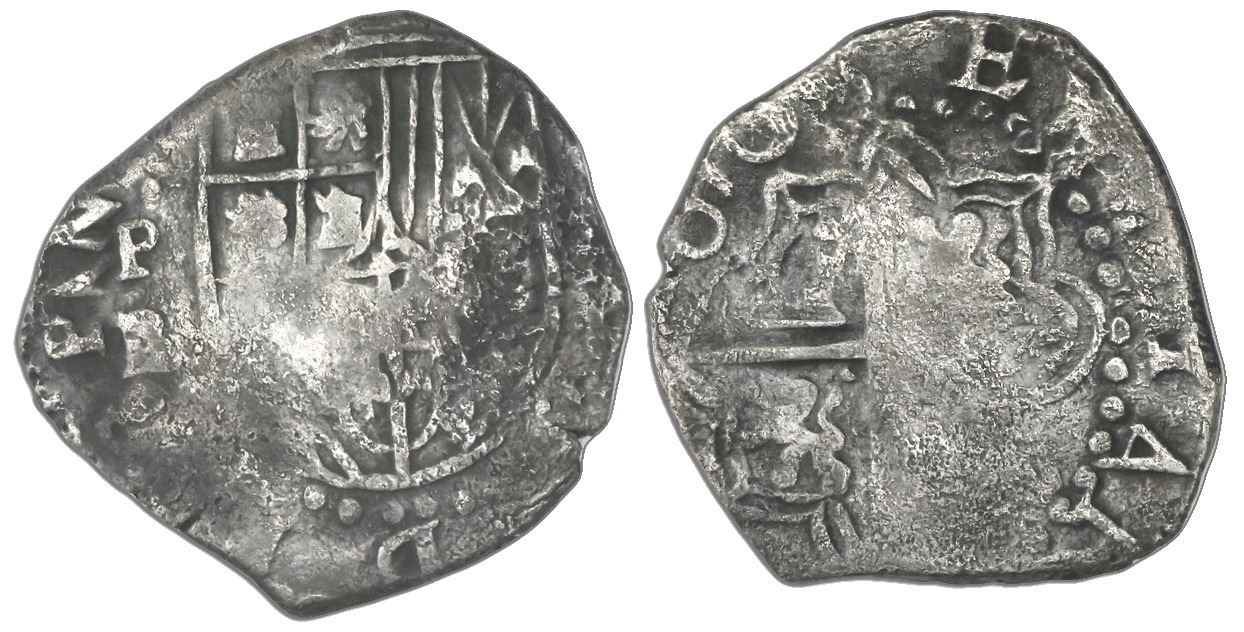 Potosi, Bolivia, cob 2 reales, (1)618PAL, rare, ex-Concepcion (1641), ex-Rudman. S-P20; KM-8. 6.27 grams. Most of date and assayer, full but partially flat shield and cross, localized surface corrosion (otherwise Fine), deeply toned. From the Concepcion (1641), and pedigreed to the Isaac Rudman collection.