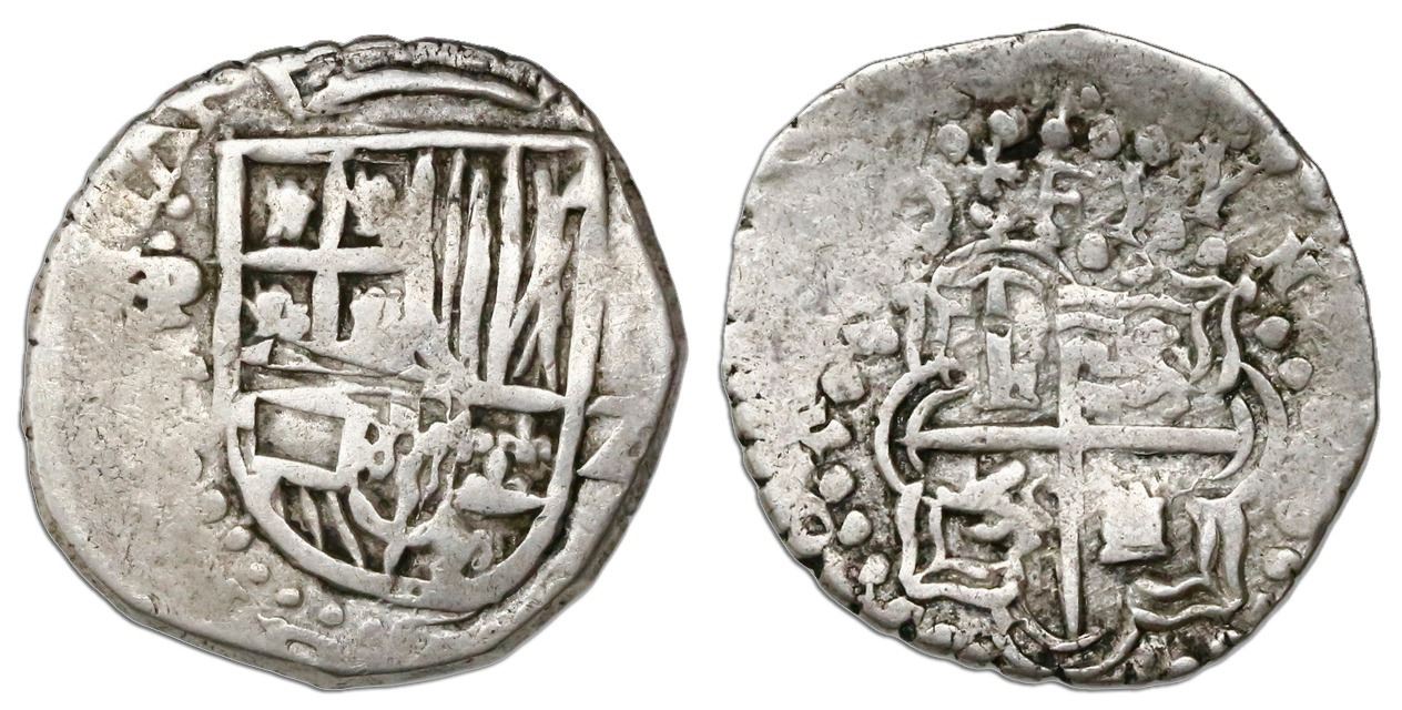 Potosi, Bolivia, cob 2 reales, (161)8T, rare. S-P21; KM-8; CT-357. 6.71 grams. Bold full shield lacking eagles in Sicily, small and full but doubled and off-center cross-and-tressure with legend starting as EY on that side (missing the T in ET), large 8 in date, Fine+ with some toning in crevices.