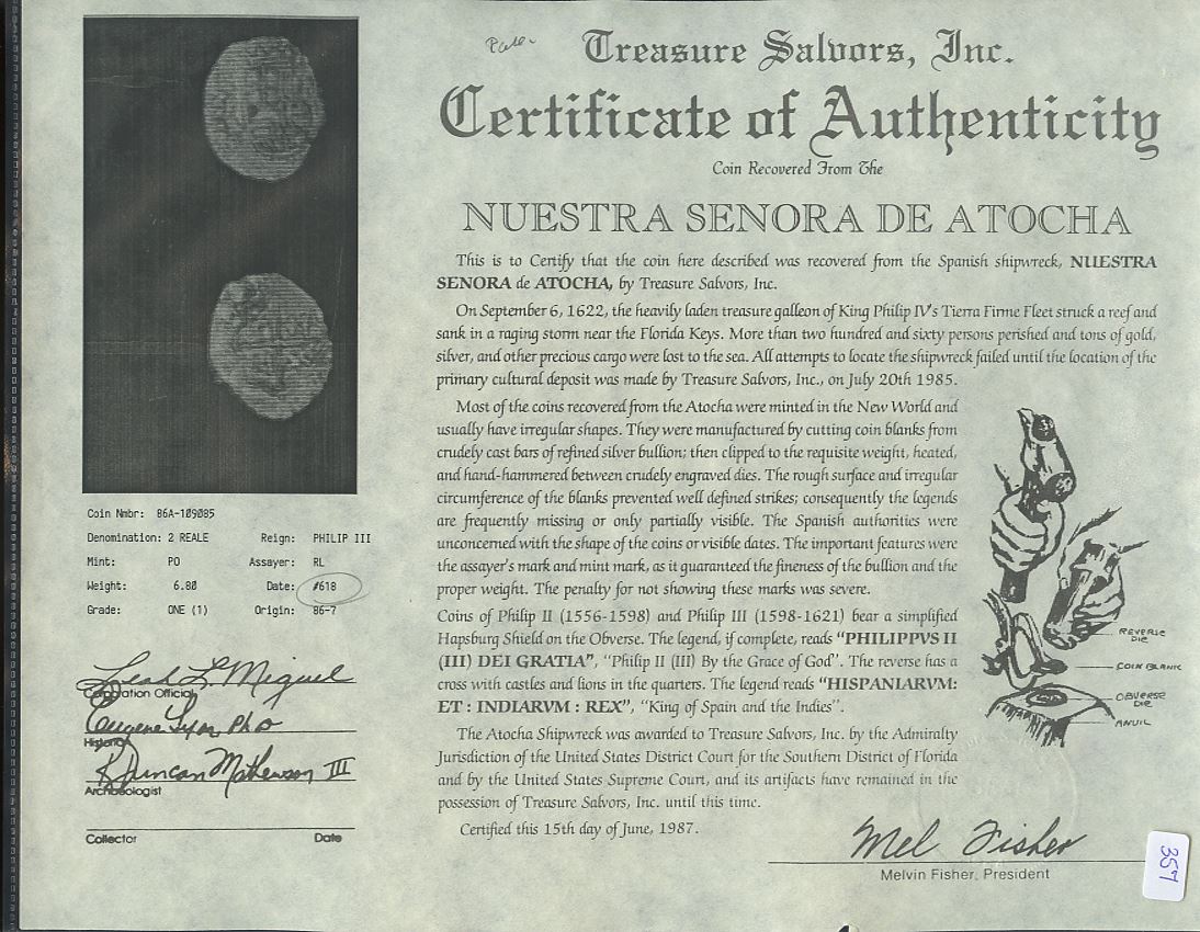 All items are genuine unless noted. Most shipwreck coins and artifacts come with a certificate of authenticity (please check the description for each item). By bidding in this auction you understand and agree to the Terms and Conditions posted here.