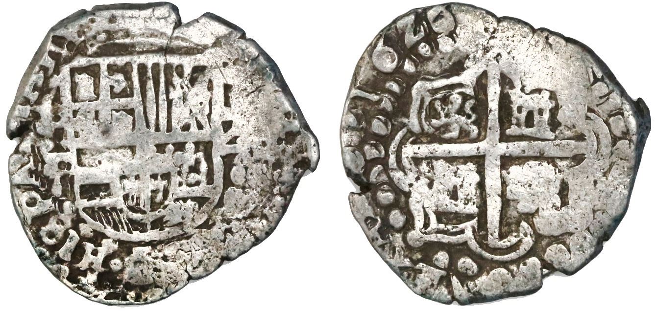 Potosi, Bolivia, cob 2 reales, 1626P/T, quadrants of cross transposed, very rare. S-P23. 6.75 grams. Full and bold date, good full shield and cross, full P-P/T (possibly P/T/P, as odd as that sounds), Fine+ with contrasting sediment in crevices. See note in previous lot regarding the neat style of this issue.