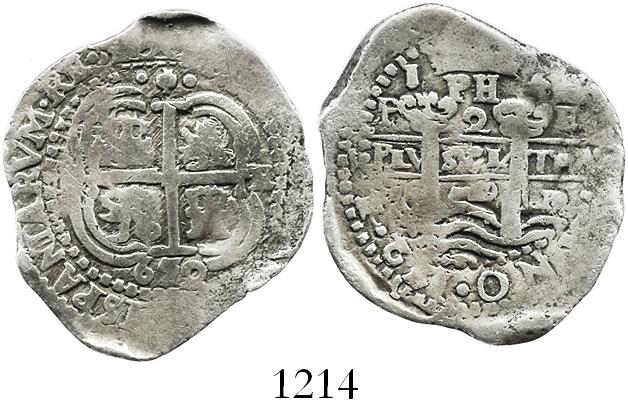 Potosi, Bolivia, cob 2 reales, 1652E post-transitional (transitional Type VII), 1-PH-(6 at top), rare. S-P37a; KM-16; CT-unl. 5.9 grams. Broad flan with good full cross and pillars-and-waves, 3 dates, bold PH, much legend, Fine with flat spots, lightly toned.