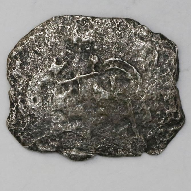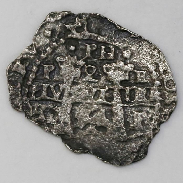 Potosi, Bolivia, cob 2 reales, 1654E, dot-PH-dot at top. S-P37a; KM-16; CT-899. 3.09 grams. Thin from corrosion with weak cross but decent pillars. Recovered from: Maravillas, sunk in 1656 off Grand Bahama Island