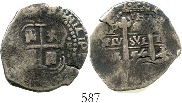 Potosi, Bolivia, cob 2 reales, 1656E, PH at top. S-P37a; KM-16; CT-900. 6.8 grams. Broad flan with full crown above pillars, full cross and PHILIP(VS), some flatness but no corrosion, darkly toned on fields. Pedigreed to our Auction #5, with lot-tag #589, and with certificate. From the Piedmont, sunk in 1795 off Cornwall, England