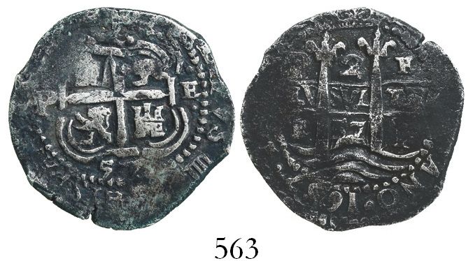Potosi, Bolivia, cob 2 reales, 1657E. S-P37a; KM-16; CT-905. 6.44 grams. Broad, round flan (almost Royal-like) with choice full pillars and cross, the latter slightly doubled, three dates (full 1657 in legend), no corrosion, mostly darkly toned. Recovered from: Unidentified ca.-1671 wreck in Seville harbor, Spain
