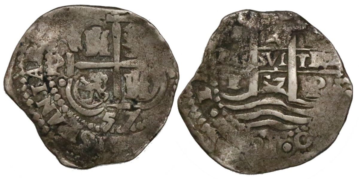 Potosi, Bolivia, cob 2 reales, 1657E. S-P37a; KM-16; CT-905. 4.83 grams. Broad flan with bold full waves and full pillars, nearly full cross, off-center strike with two dates, lightly toned AVF.