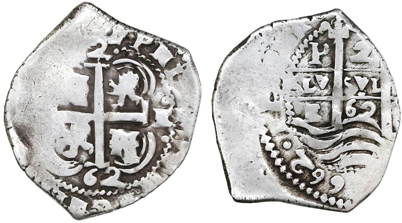 Potosi, Bolivia, cob 2 reales, 1662E. S-P37a; KM-16; CT-910. 5.36 grams. Good full cross, off-center pillars with full 1662 date in legend (three dates overall), AVF with toning around details.
