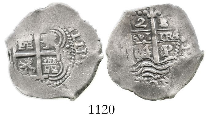 Potosi, Bolivia, cob 2 reales, 1664E. S-P37a; KM-16; CT-912. 6.8 grams. Choice full pillars, nearly full cross, 2 dates, Fine+ with contrasting toning but peripheral flatness. From the 1696 Panama hoard, with photo-certificate, and pedigreed to the Ponterio auction of October, 1992, with original lot-tag #659.