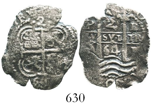 Potosi, Bolivia, cob 2 reales, 1664E. S-P37a; KM-16; CT-912. 2.6 grams. Thin from corrosion but well detailed, with full pillars-and-waves and cross, 2 dates. Recovered from: Consolacion, sunk in 1681 off Santa Clara Island, Ecuador