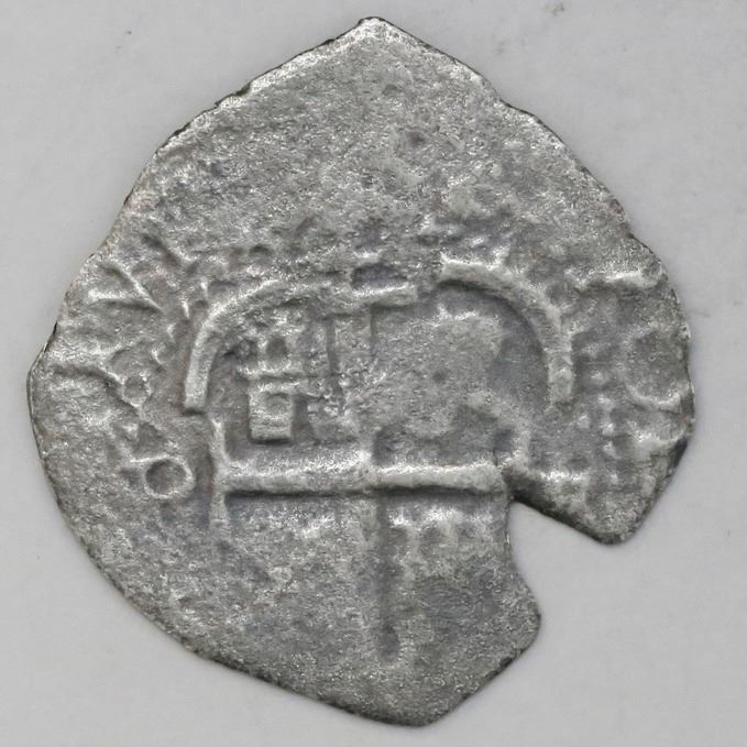 Potosi, Bolivia, cob 2 reales, 1664E. S-P37a; KM-16; CT-912. 3.36 grams. Thin from corrosion, edge-crack (as made), decent pillars-side details. With HRC photo-certificate #5142. Recovered from: Consolacion, sunk in 1681 off Santa Clara Island, Ecuador