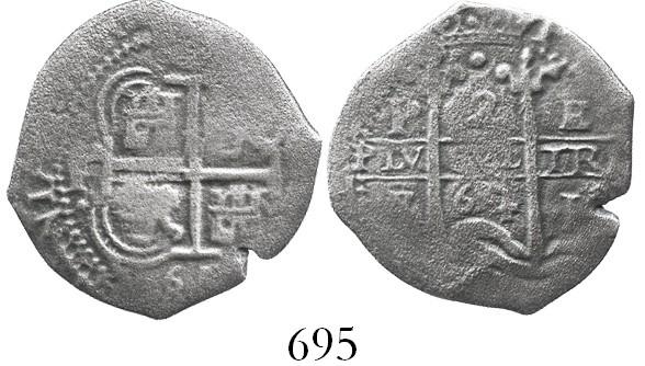 Potosi, Bolivia, cob 2 reales, 1664E. S-P37a; KM-16; CT-912. 4.4 grams. Good full pillars and cross, 2 dates, worn and thin. From the Consolacion, sunk in 1681 off Santa Clara Island, Ecuador, with ROBCAR photo-certificate #M100241.