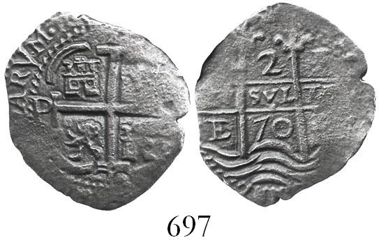 Potosi, Bolivia, cob 2 reales, 1670E. S-P37b; KM-24; CT-597. 2.6 grams. Choice waves topped with bold date and full pillars, decent but incomplete cross, thin around the edges. From the Consolacion, sunk in 1681 off Santa Clara Island, Ecuador, with ROBCAR photo-certificate #M100243.