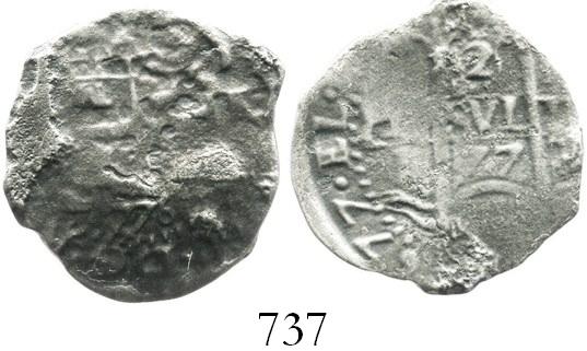 Potosi, Bolivia, cob 2 reales, 1677+776E, scarce error.