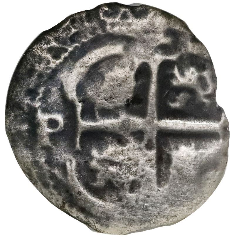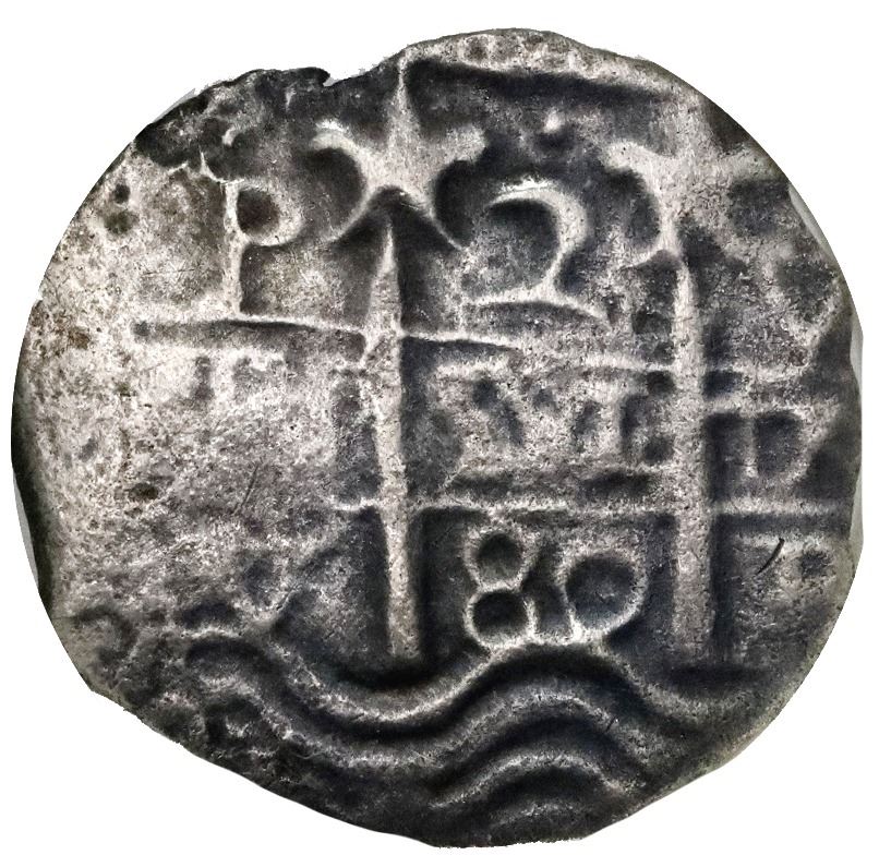 Potosi, Bolivia, cob 2 reales, 1680V, ANACS VF 20 / Consolacion. S-P39; KM-24; Cal-406. A bit smooth but nicely detailed with full pillars and nearly complete cross, bold date, in an older style ANACS holder. ANACS #1000434. From: Consolacion, sunk in 1681 off Santa Clara Island, Ecuador