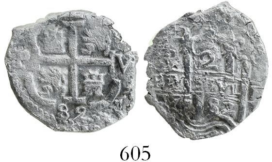 Potosi, Bolivia, cob 2 reales, 1682V, desirable provenance. S-P39; KM-24; CT-611. 4.34 grams. Nice full cross, bold but doubled pillars, two dates and assayers, light surface corrosion, non-toned. Recovered from: Feversham, sunk in 1711 off Nova Scotia, Canada