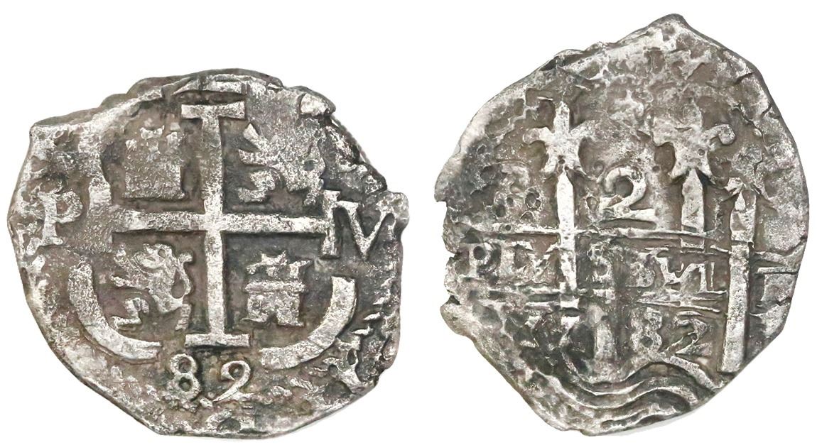 Potosi, Bolivia, cob 2 reales, 1682V. S-P39; KM-24; CT-611. 4.34 grams. Choice full cross-lions-castles, bold and full but double-struck pillars, two clear dates, minimal surface corrosion, good toning. Pedigreed to our Auction #15 (lot #605), with our photo-certificate. Recovered from: Feversham, sunk in 1711 off Nova Scotia, Canada